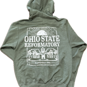 Our classic logo with a twist! Black tee with college design of distressed letters and image. 50% Cotton 50% Polyester blend, machine washable, unisex sizes.
